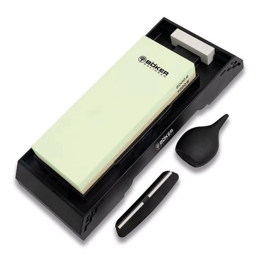 With the sharpening stations, Boker Manufactory Solingen offers comprehensively equipped professional solutions for expertly sharpening any type of steel blade. The centrepieces of the sets are a combined water sharpening stone with 2 grits each. Only high-grade Corundum of the highest homogeneity and quality is used for the stones. The usable grinding surface is 200 mm x 80 mm. The elaborate and well thought-out sets contain: – A tray with non-slip rubberised feet